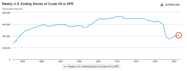 上图是美国战略石油储备的曲线,最近六年出现了明显的下降,2023年年中跌至阶段性低点,当时的战略库存总量约为3.46亿桶。过去三年战略石油储备持续反弹,从今年二月份开始,曲线又出现了拐头向下的迹象。原因非常明确,就是美国和伊朗之间的战争导致高油价,美国不得不释放战略石油储备以稳定供应端。