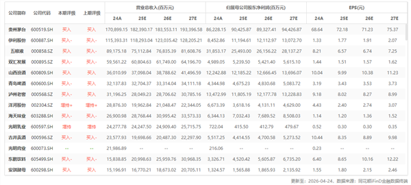 行业重点公司最新盈利预测综合值