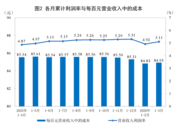 1—3月份,规模以上工业企业实现营业收入33.19万亿元,同比增长5.0%;发生营业成本28.19万亿元,增长4.5%;营业收入利润率为5.11%,同比上升0.46个百分点。