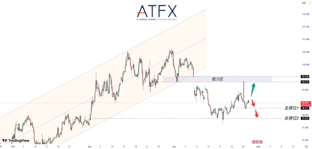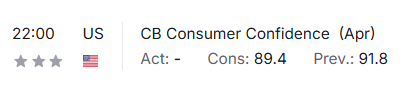 ATFX:今晚市场焦点将转向美国4月CB消费者信心指数。市场预期该指数将从3月的 91.8 回落至 89.4;该数据主要反映美国消费者对当前经济、就业市场和未来收入前景的看法,也常被视为消费支出的领先指标。(来源:Investing.com)