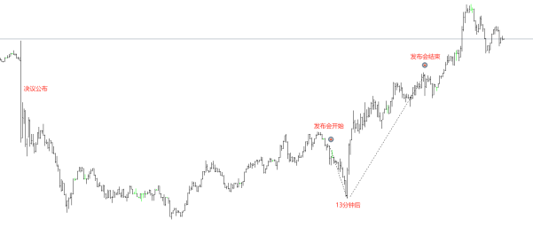 14点30分,日本央行行长植田和男开始进行发布会直播,在他讲话的前13分钟,美元兑日元持续下跌,从讲话开始时的159.19下跌至最低159.02点,幅度17点。随后的讲话时段里,美元兑日元持续上涨,最终在讲话结束时达到最高点159.44,相比开始讲话时的159.19升高25点。