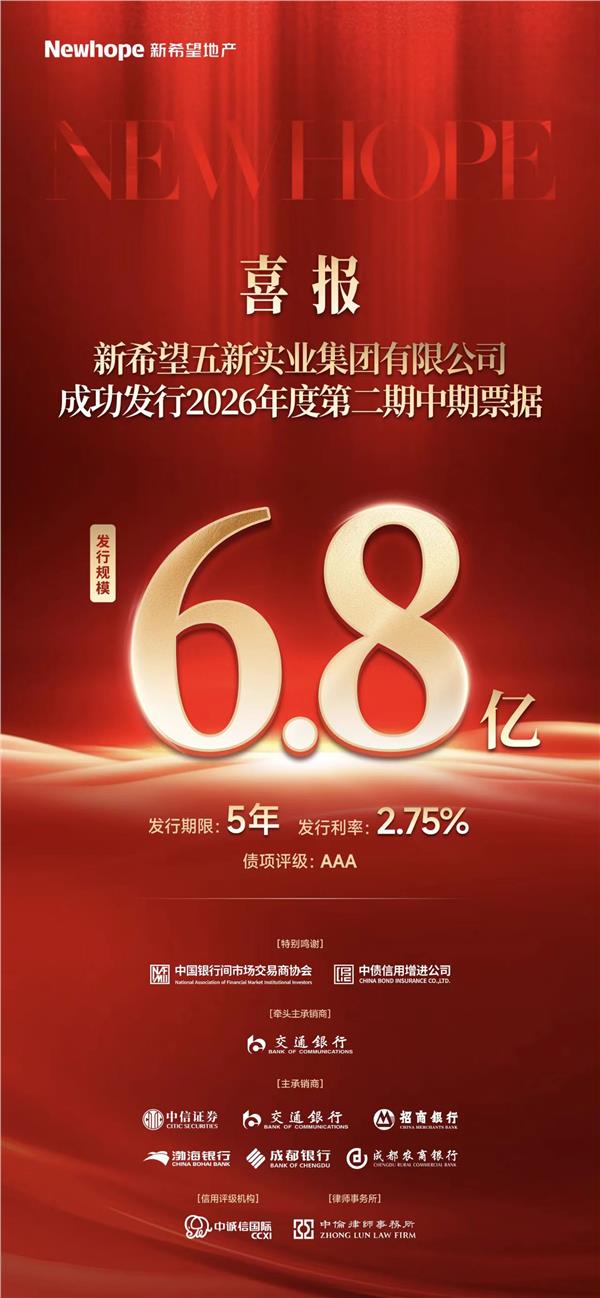 2026年4月28日,新希望五新实业集团有限公司(以下简称“新希望地产”)成功发行2026年度第二期中期票据。此次发行总额为6.8亿元,票面利率2.75%,并由中债信用增进投资股份有限公司提供全额保证担保。全场认购倍数1.97倍,吸引投资者积极参与认购。